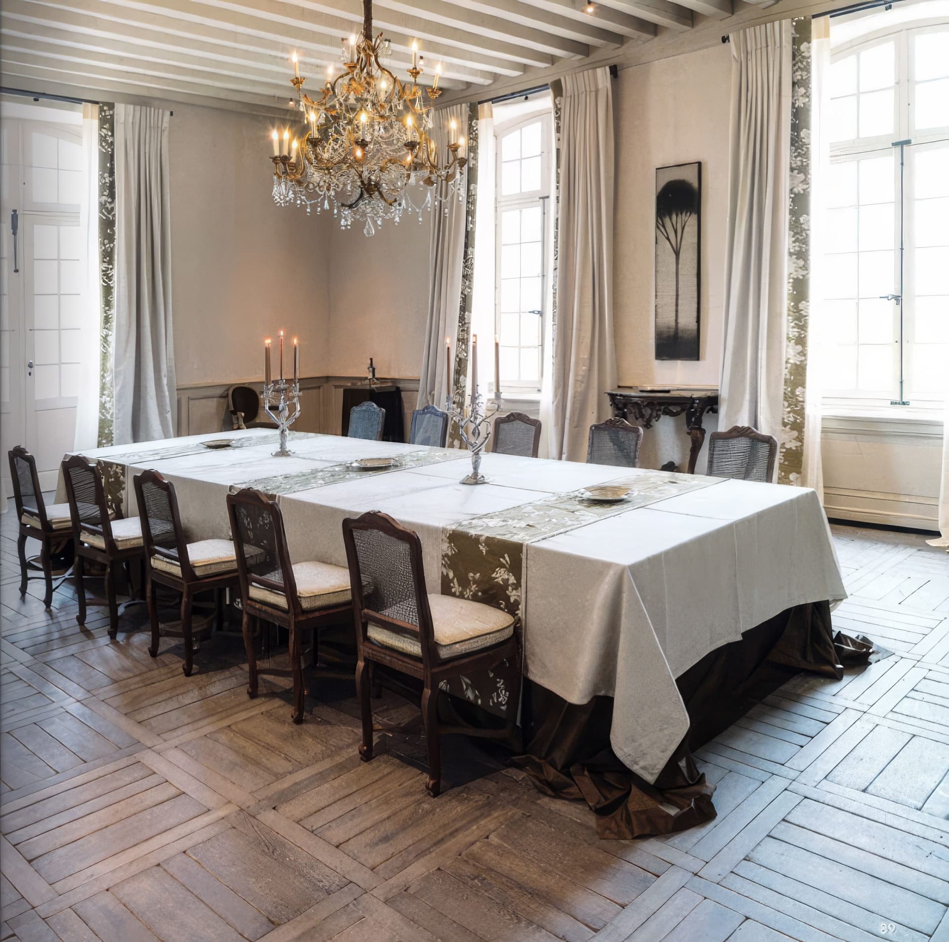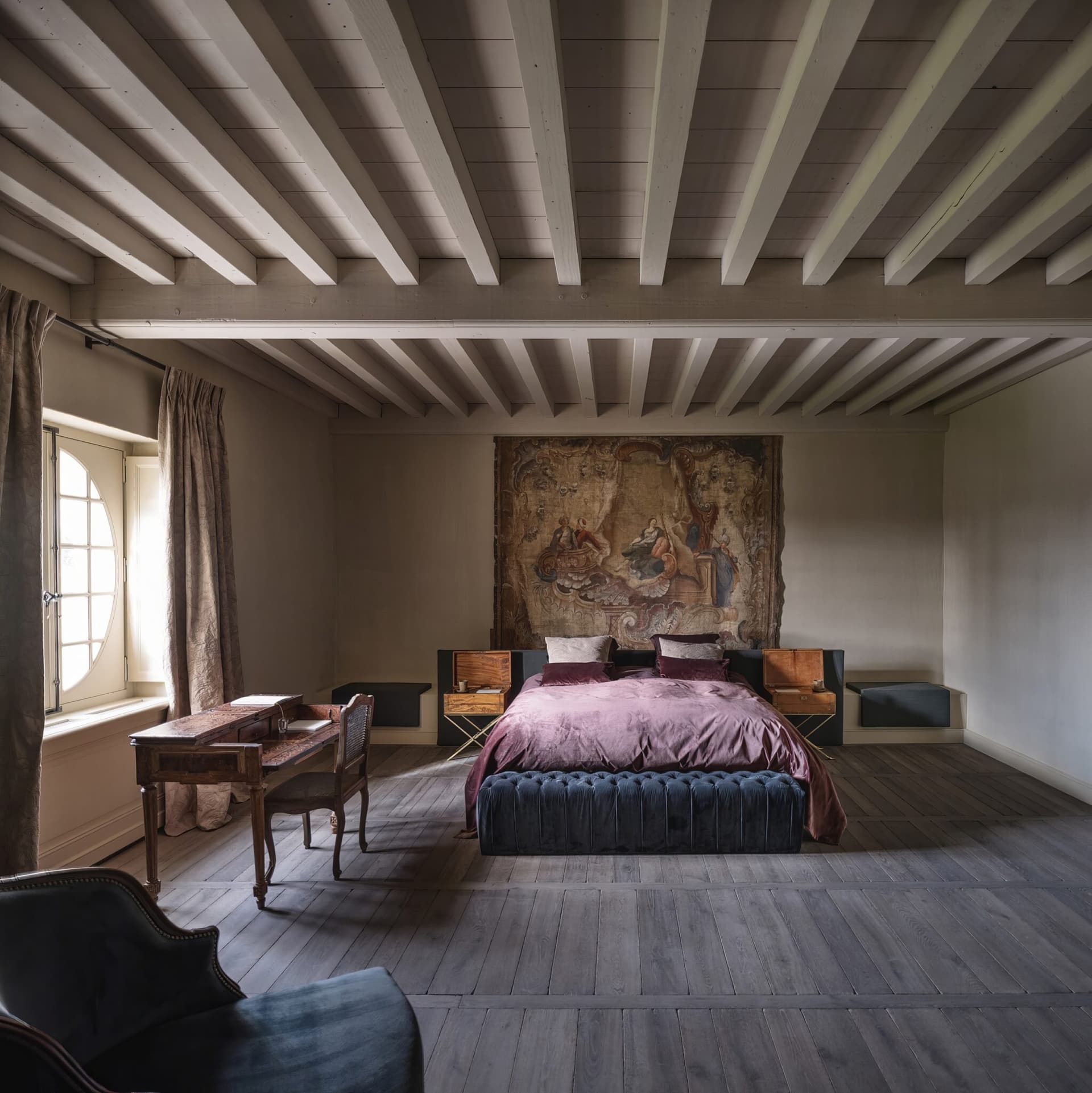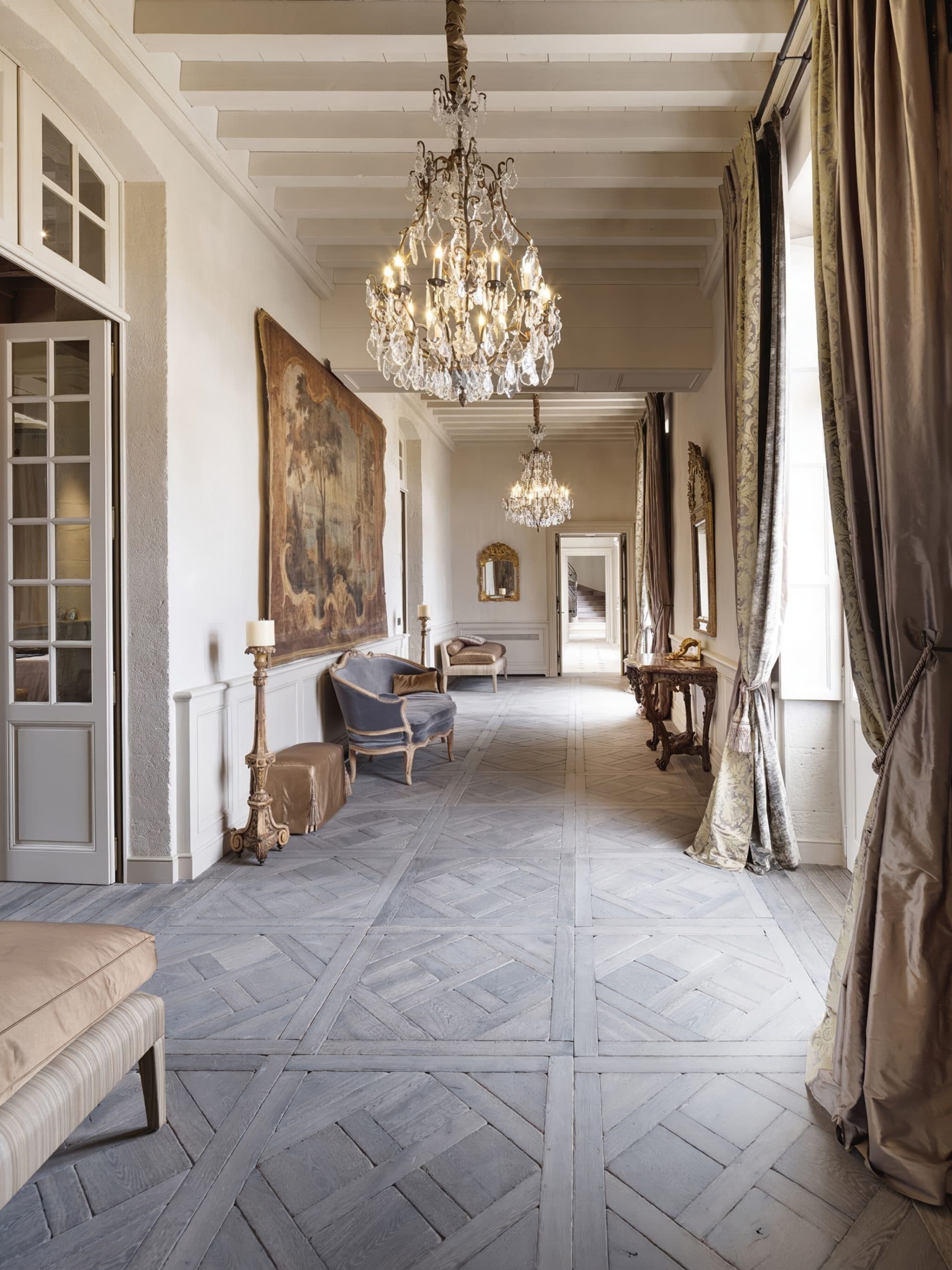 Behold a rare commission: the revival of a 17th-century French castle, finished with our Harvested European Mountain Oak in a bespoke grey patina. Rather than specifying genuine reclaimed timber, this project demonstrates how our colour science can honour an ancient interior with newly quarried wood. Working alongside local finishers and colourists, we have developed mineral-based pigments and organic formulations that bond with the grain to achieve nuanced, naturally aged tones. The surface is tuned through a sequence of slow, hand-worked steps until the hue aligns precisely with the client’s brief. Floors, doors, walls and tables were completed by hand in situ. A living example of slow design: handmade, historically sympathetic, and engineered to endure.