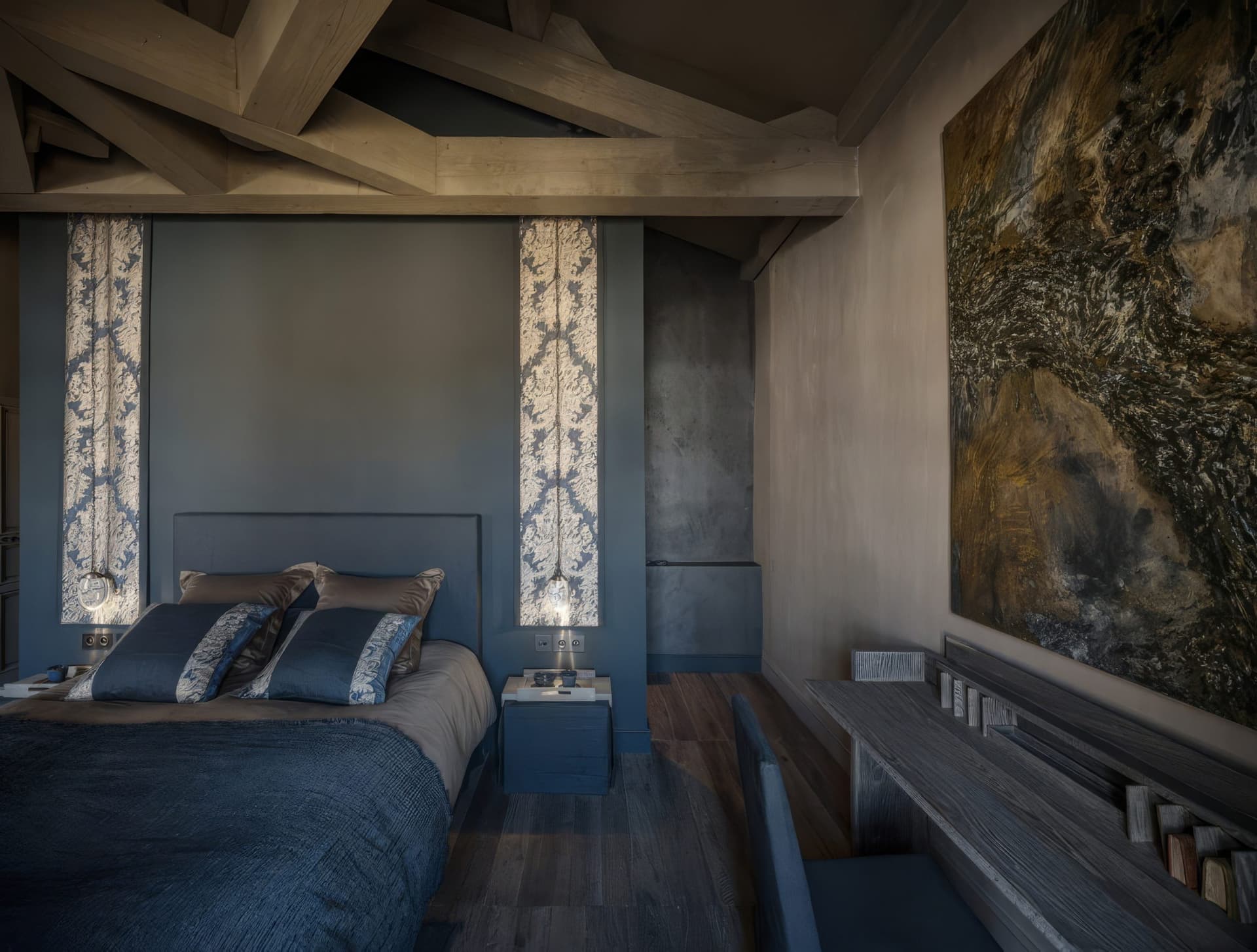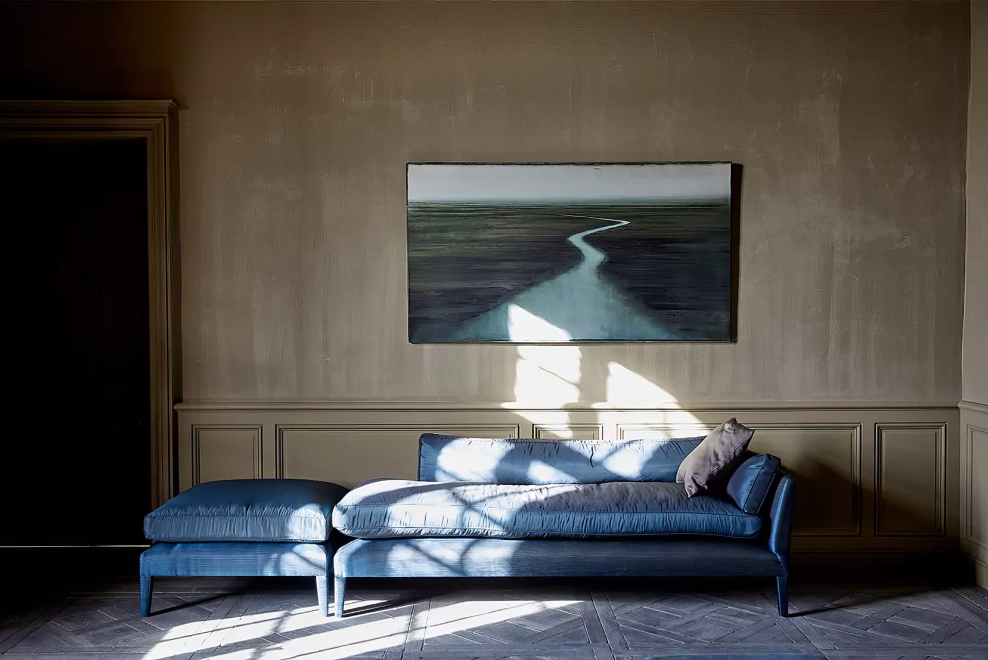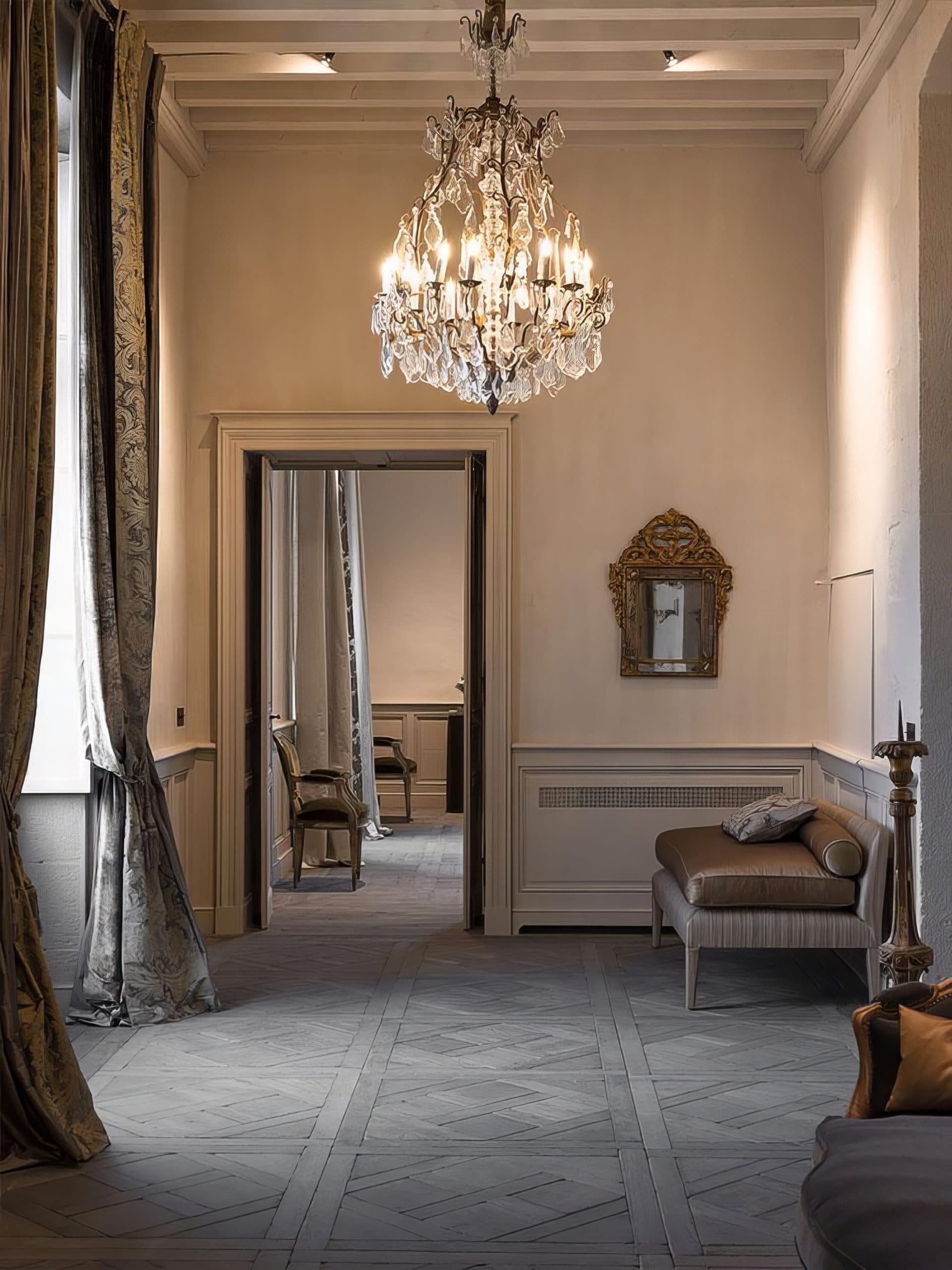 Behold a rare commission: the revival of a 17th-century French castle, finished with our Harvested European Mountain Oak in a bespoke grey patina. Rather than specifying genuine reclaimed timber, this project demonstrates how our colour science can honour an ancient interior with newly quarried wood. Working alongside local finishers and colourists, we have developed mineral-based pigments and organic formulations that bond with the grain to achieve nuanced, naturally aged tones. The surface is tuned through a sequence of slow, hand-worked steps until the hue aligns precisely with the client’s brief. Floors, doors, walls and tables were completed by hand in situ. A living example of slow design: handmade, historically sympathetic, and engineered to endure.