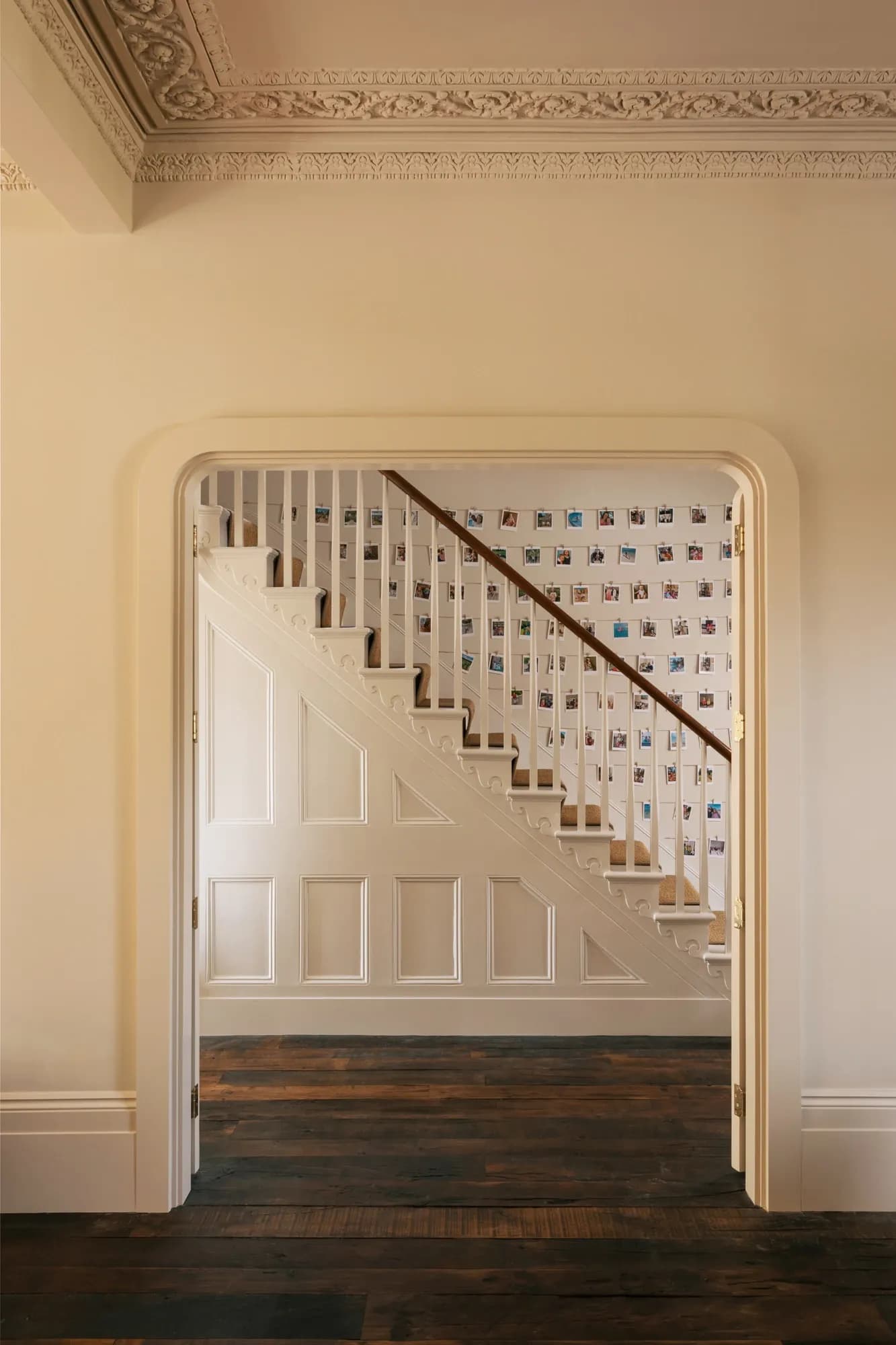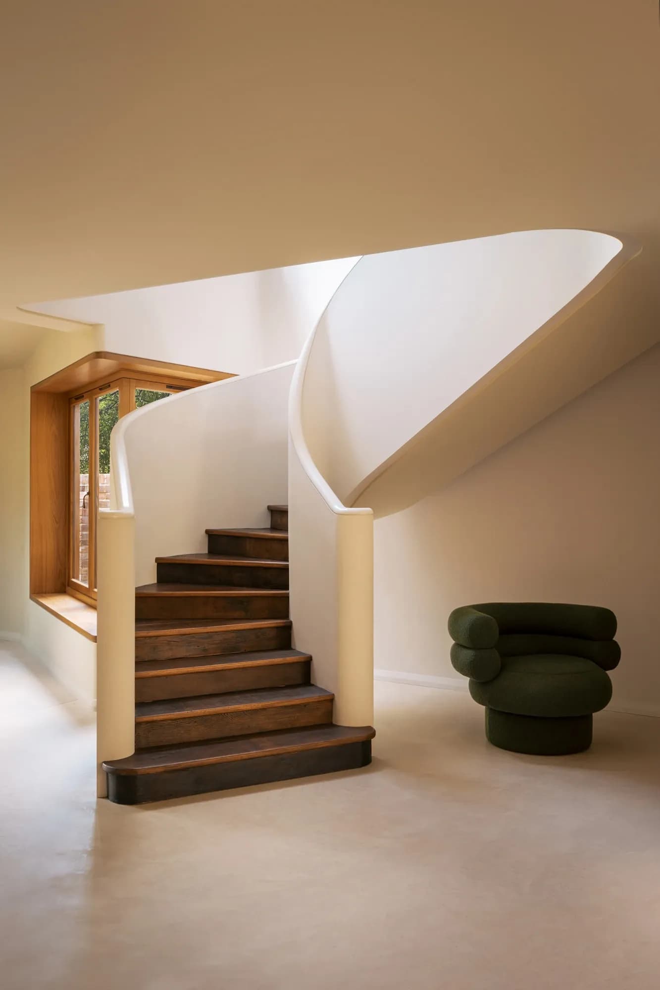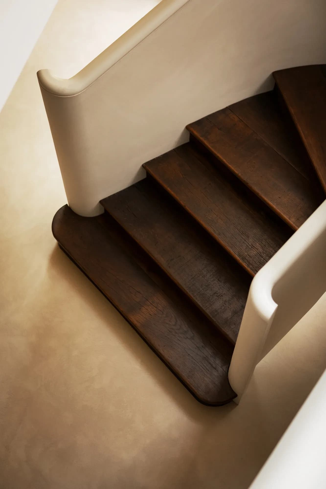 At its centre: Re:claimed Antique European Oak — circa 250–300 years of lived history drawn from antique European structures once animated by work and ritual. Time is visible in the softened grain and deepened tonality; the varied board widths — intentional, not incidental — let the timber behave like timber. A sculpted stair curve in the same oak becomes a moment of still drama — a piece of architecture that behaves like sculpture. The soft handover to microcement, the calm fall of light across the joint, the absence of fuss — these details are not added; they are revealed.