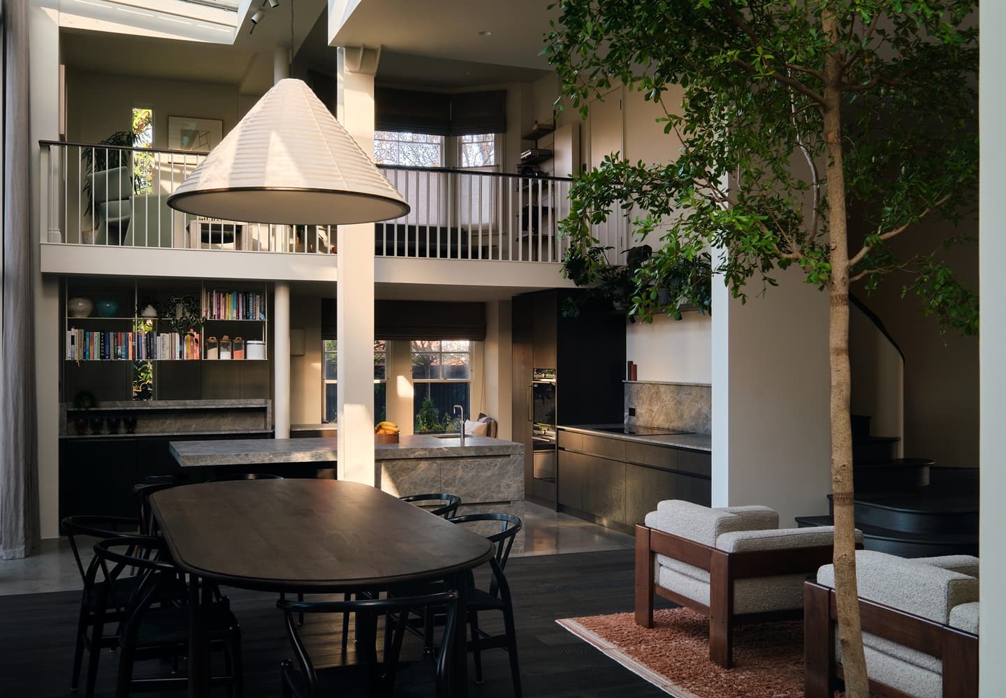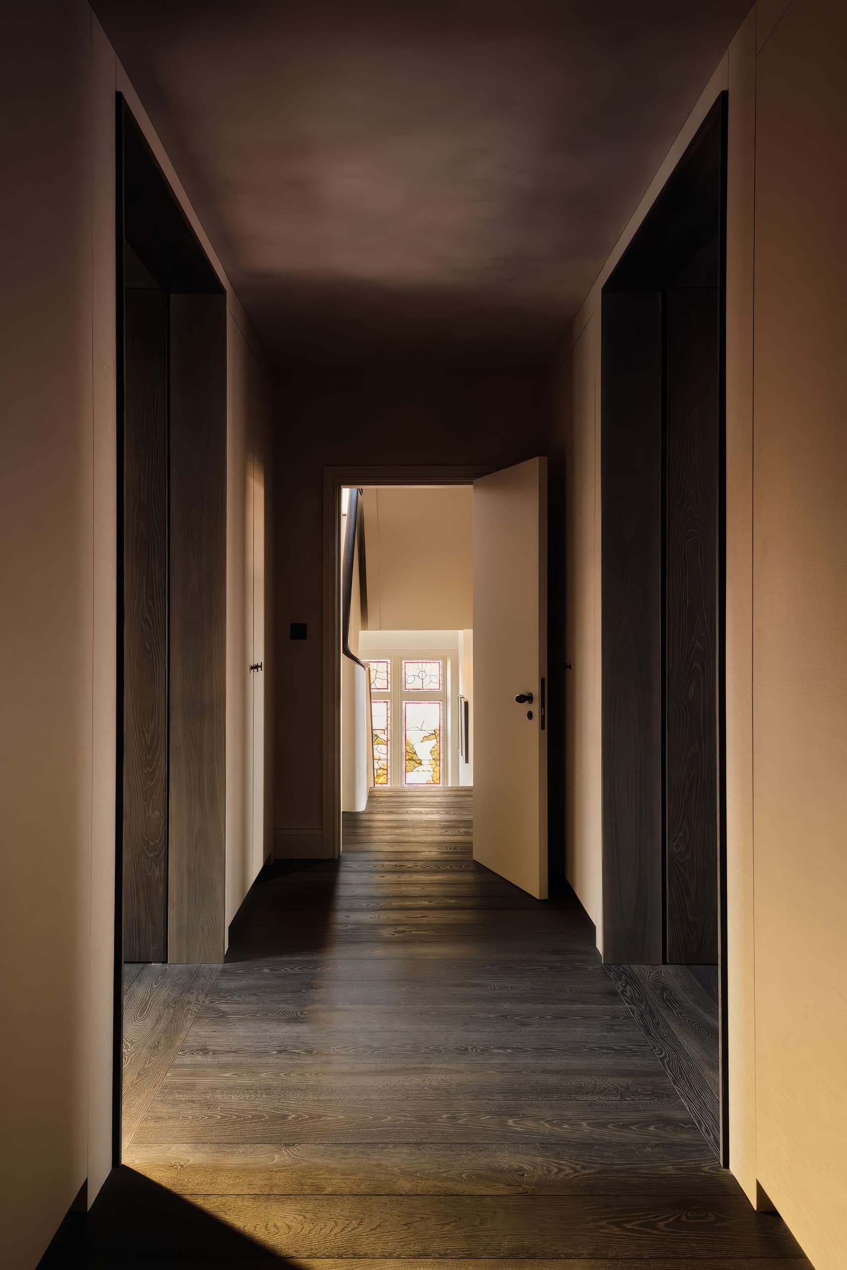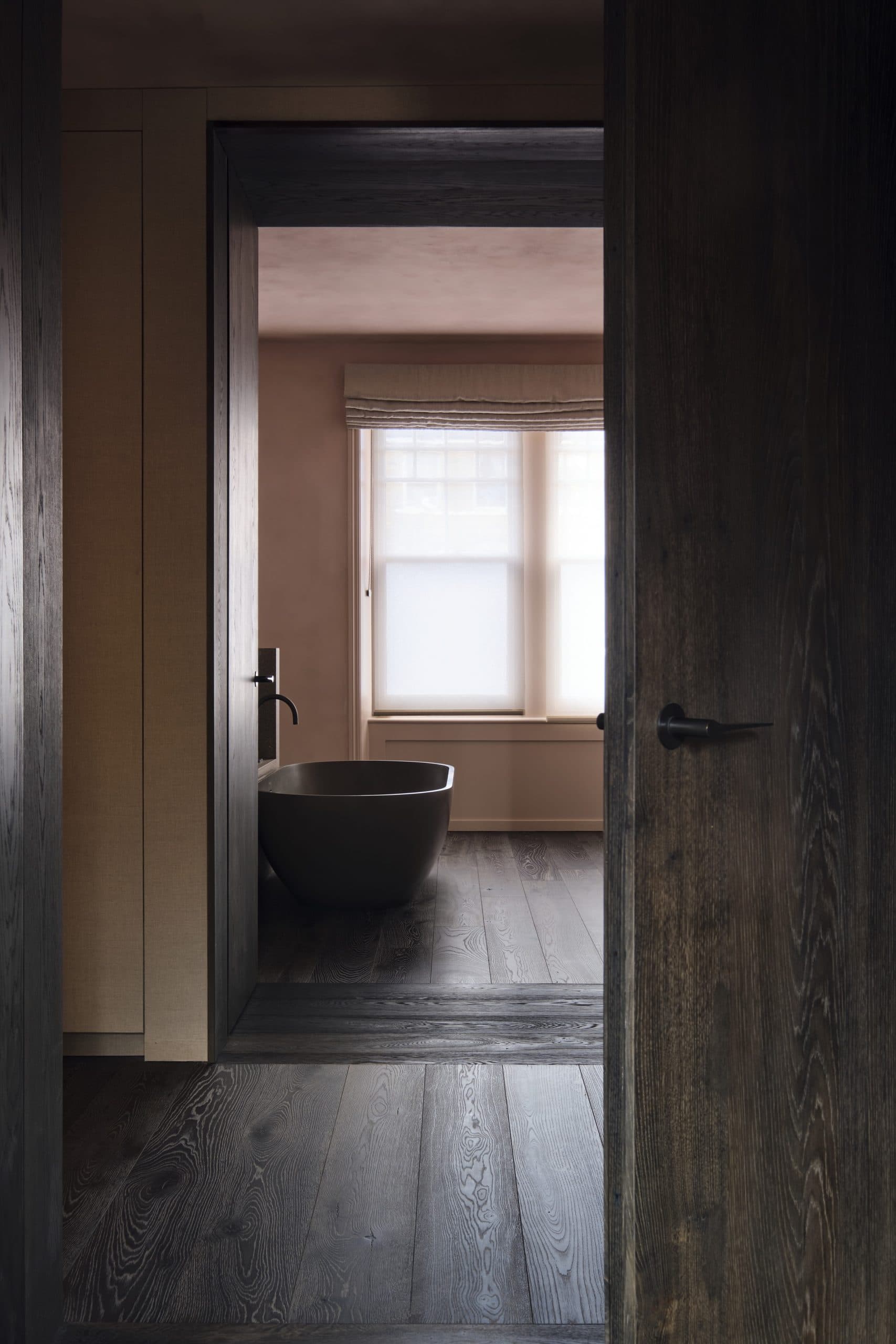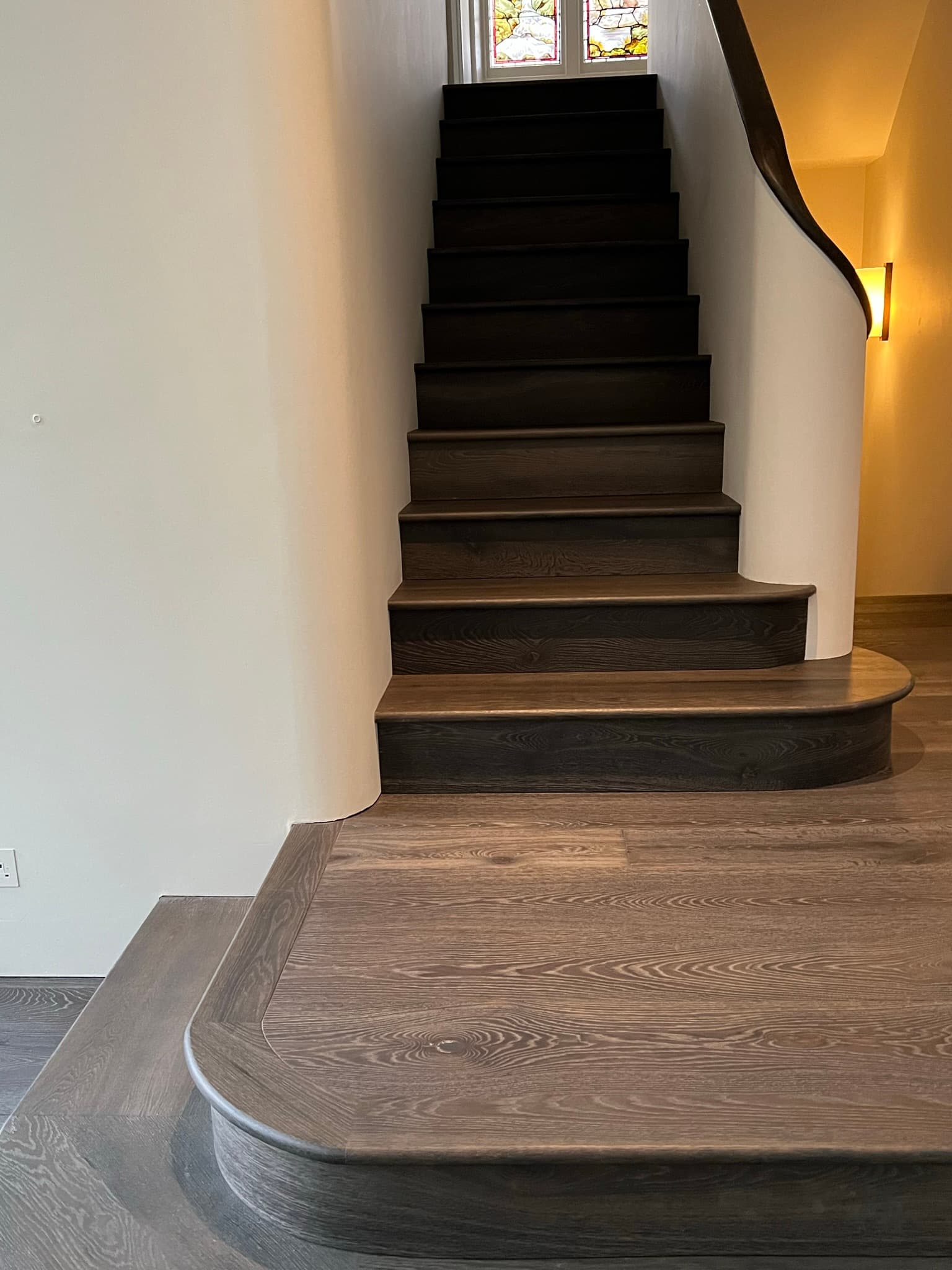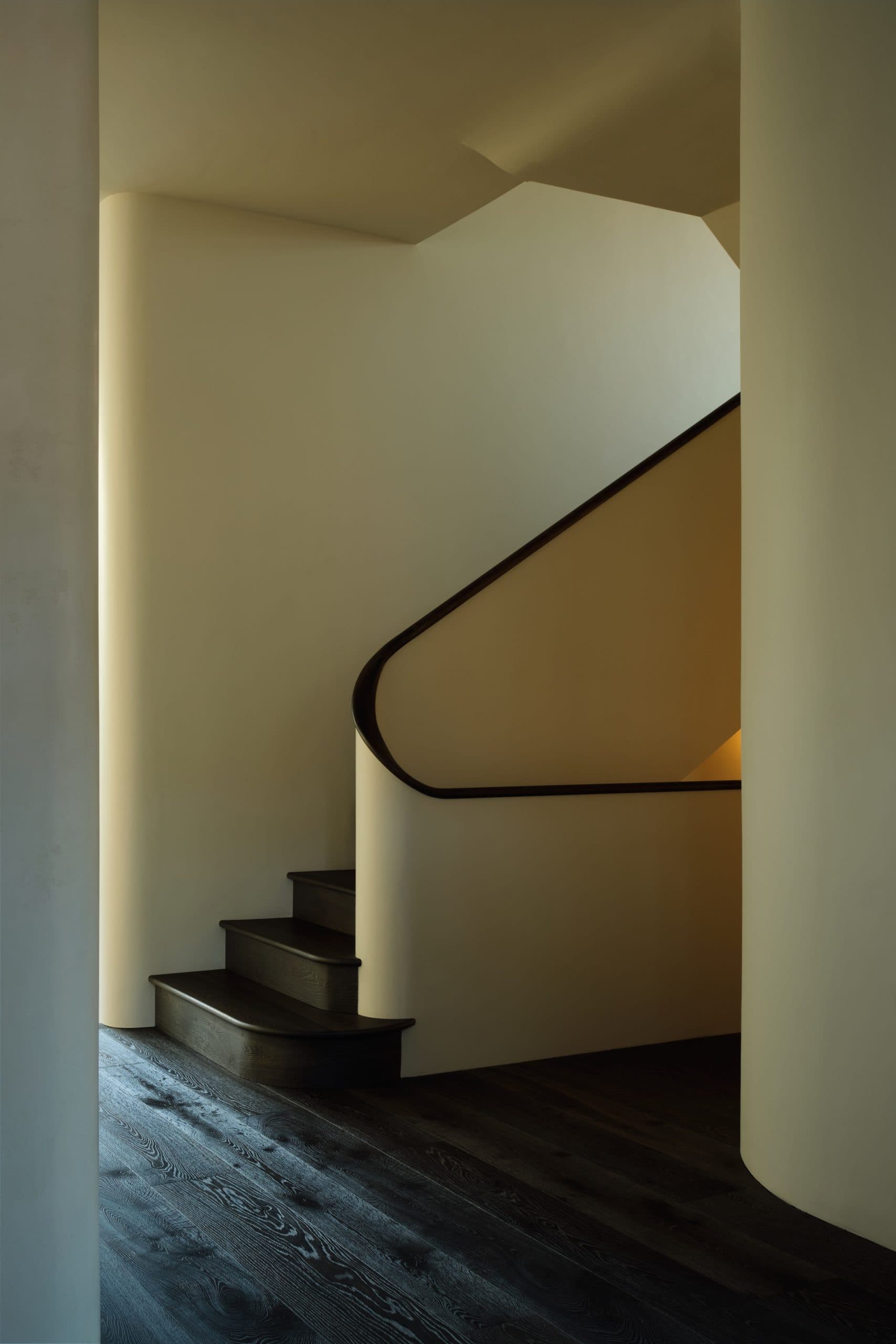 Behold the subtle tonal variations and tactile surface that distinguish our Driftwood Collection. This London renovation provides the perfect setting to witness its naturally weathered aesthetic — a collection defined by timeless character, structural strength and enduring beauty. The client commissioned a bespoke patina inspired by Driftwood, tuned to a deeper tone, and made the timber the organising principle of the entire scheme: custom staircases with prolonged curved risers, doors, door frames, and almost every interior element across both levels — kitchen and bathrooms included — to preserve a unified, continuous material language.