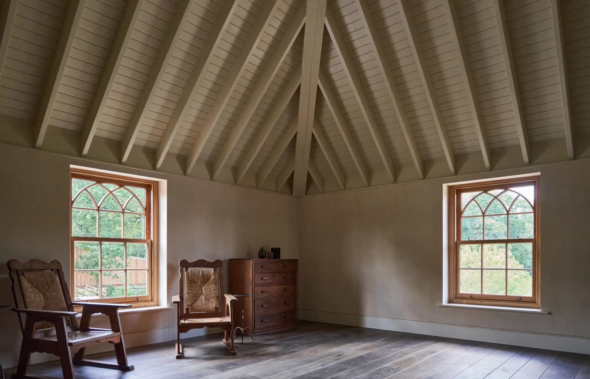 For this project, our Highland Manor oak was selected and supplied with a subtle hand-distressing to encourage a gently timeworn character from day one. The oak's mellow, natural tones sit easily among the raw materials and garden surroundings, ageing with dignity while retaining an enduring quiet elegance. It is a floor calibrated to feel rooted — not installed.
